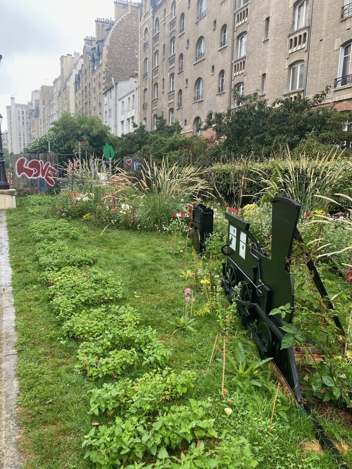 Hommage à plus de 170 ans d’histoire de la ligne d’Auteuil, premier réseau de voyageurs, par une gare jardin au-dessus des rails du RER C. L’équipe projet a choisi des espèces végétales régionales locales et peu gourmandes en eau, pollinisatrices et répulsives pour certaines, et dont les graines, pour d'autres, comme la cardère sauvage nourrissent également pinçons et martinets.