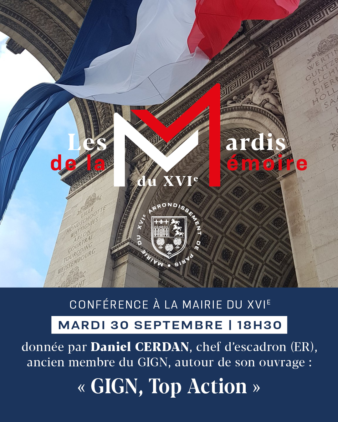 Les Mardis de la Mémoire Actualité Mise à jour le 25/09/2025 La prochaine édition des Mardis de la Mémoire se déroulera le mardi 31 septembre à 18h30 à la Mairie du XVIe et sera donnée par Daniel Cerdan, Chef d’Escadron (ER), ancien membre du GIGN, autour de son ouvrage « GIGN, Top Action ». Crédit photo : @dr